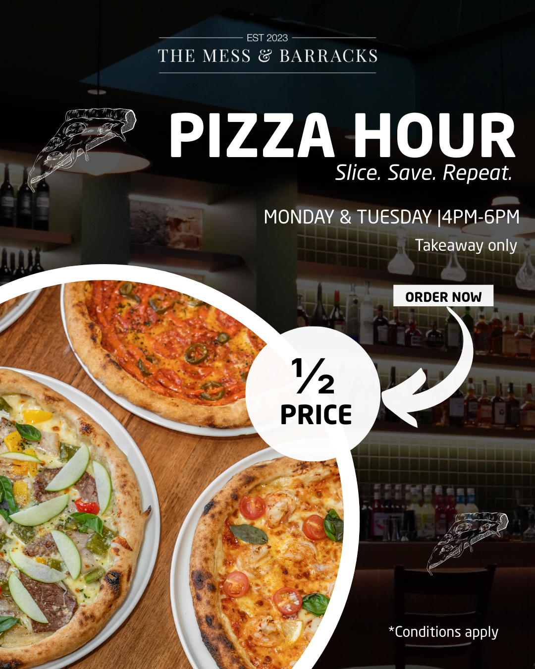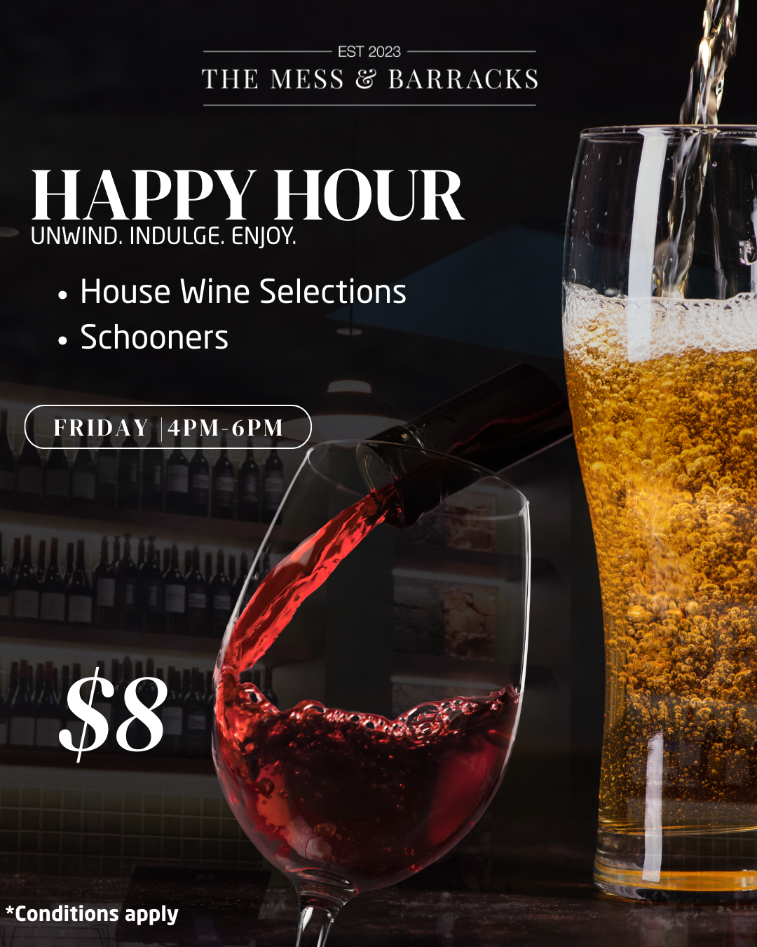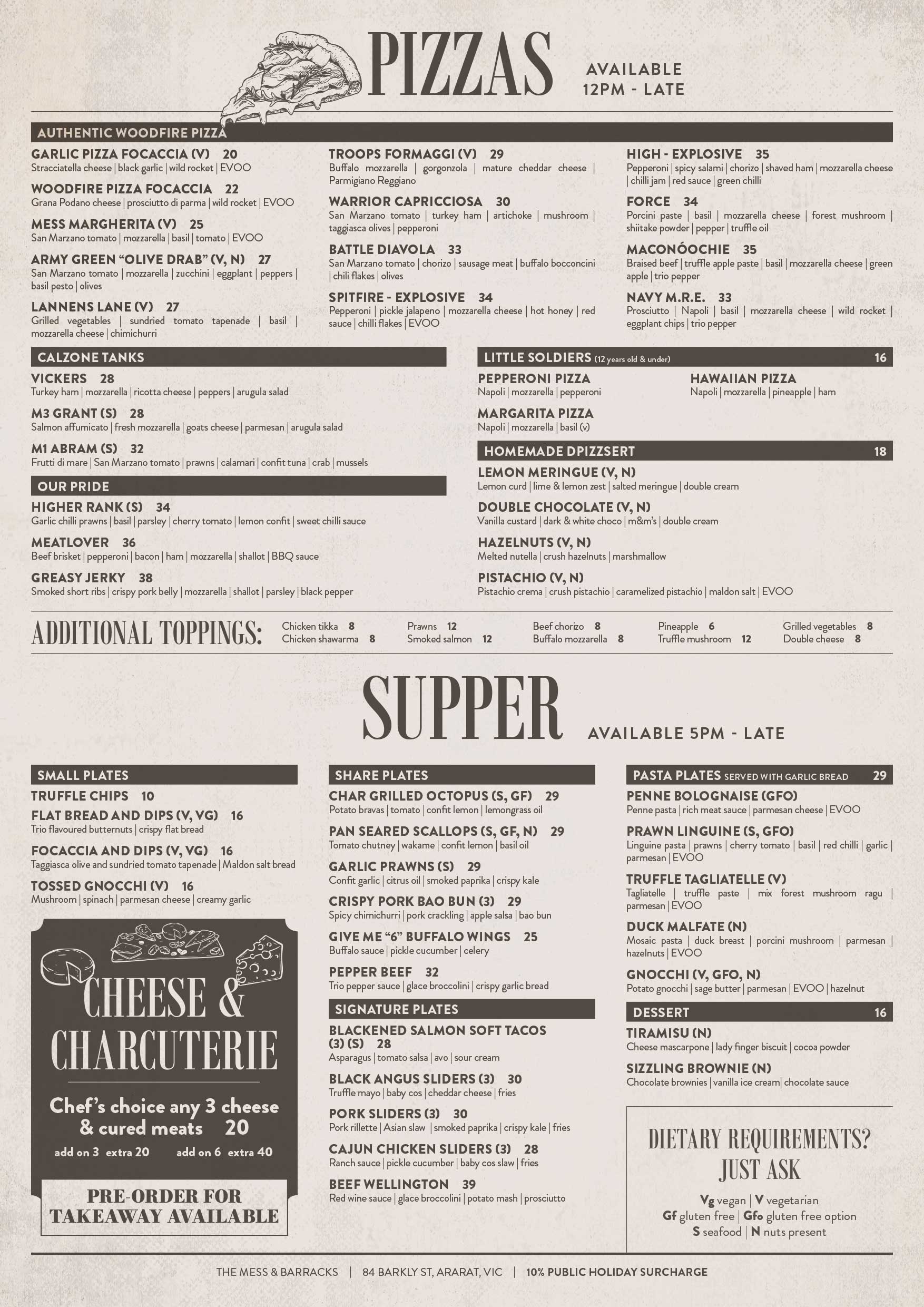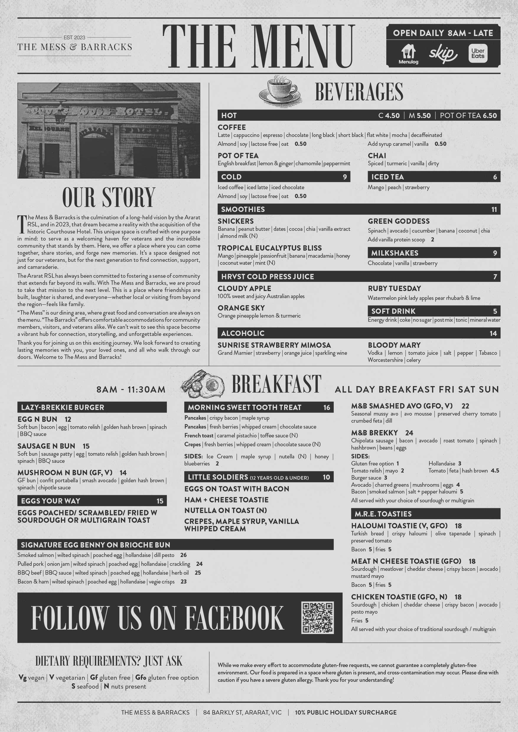 From early morning coffee through to dinner with friends. The Mess & Barracks is the place to catch up and enjoy a meal or a drink in a cosy environment.